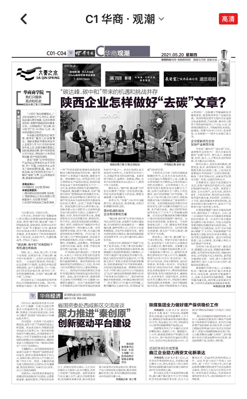 為實現“碳中和”“碳達峰”目標,需要哪些支持配合?陜西企業如何做好“去碳”文章?嘉賓表示,需要政策、經濟、技術、人才等方面支持和保障,多方配合共同推進。