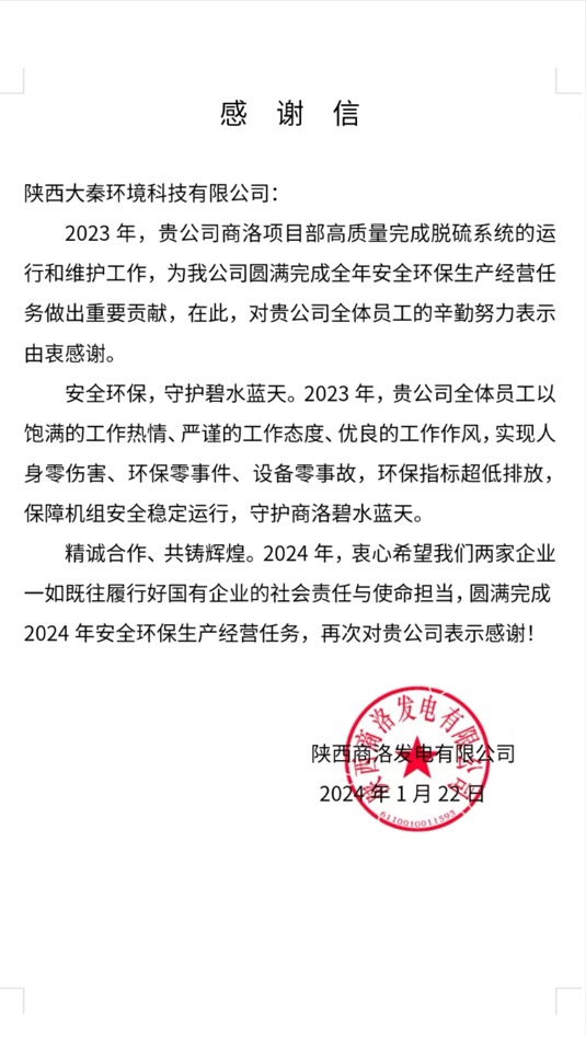 近日,大秦公司收到陜投集團商洛發電公司感謝信,來信充分肯定大秦商洛項目公司在2023年高質量完成脫硫系統的運行和維護工作,為商洛發電公司圓滿完成全年安全環保生產經營任務作出了重要貢獻。同時,商洛項目公司榮獲商洛發電公司2023年度“安全先進集體”榮譽。