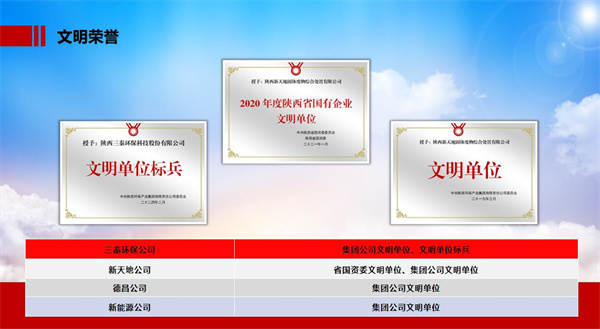 近年來,三秦環保公司堅持強化黨建+文明創建工作機制,以先進理論引領創新發展,以內強素質樹立公司形象,以時代新風激發干事熱情,以優秀文化凝聚奮進力量,全面發揮黨群團優勢,體系化推進精神文明建設工作,為公司高質量發展注入了新動能。公司黨建工作連續四年榮獲集團黨委考核優秀,基層新天地公司黨支部被省委授予“先進基層黨組織”;公司工會被省能化工會命名為“模范職工之家”;公司職工羅高鋒榮獲“陜西省勞動模范”。公司文明建設工作芝麻開花節節高,7家子公司中1家榮獲省國資委文明單位、3家獲得集團文明單位稱號。孕育新風尚,展現新作為,公司“雙百企業”改革案例入選國務院國資委改革辦、國務院國資委新聞中心組織編寫的《改革樣本:國企改革“雙百行動案例集”》;年度“雙百企業”評估被國務院國企改革辦公室評為“優秀”等級,公司經營質量不斷提升。